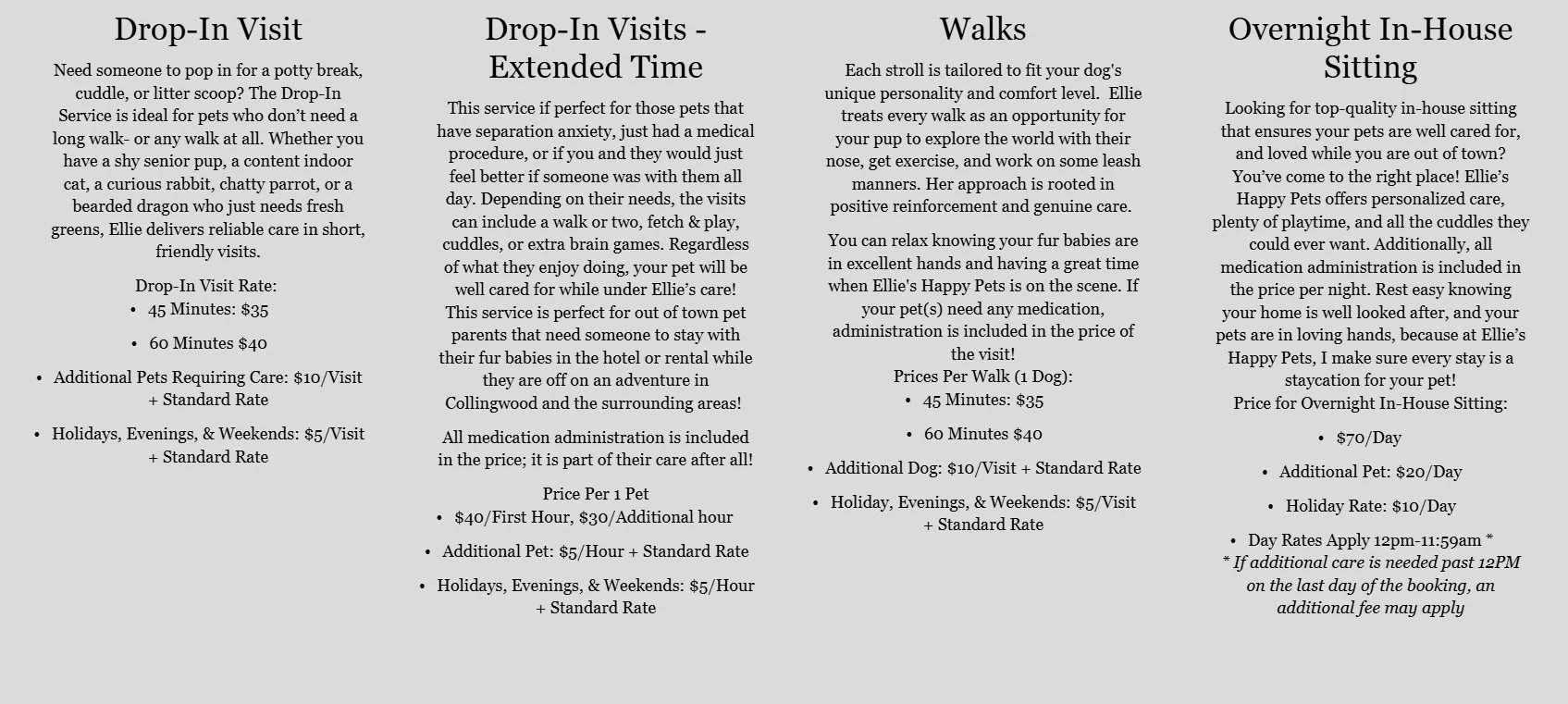 Ellie’s Happy Pets was founded in 2025 by Ellie Lom. She grew up in Utopia, ON, and her deep-rooted love for animals was apparent from a very young age. After moving around the country to study and work in various industries, she settled in Collingwood, ON. Here, Ellie followed her lifelong passion for animals and created a pet-focused business with one clear mission: top-quality care driven by compassion, love, empathy, and ethical methods.